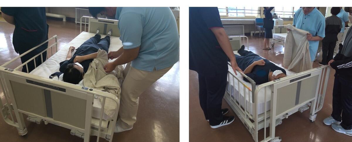 10月1日(水)、福祉サービス科3学年とくしろせんもん学校介護環境科の学生と合同学習を行いました。衣服の着脱介助では端座位と仰臥位での方法を、移乗介助ではベッド上の体位変換から車椅子への移乗を実践し、介護技術を学ぶことで他校との交流を深めました。